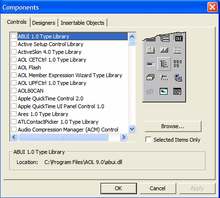 This is the component box, where you disable and enable components. If your box is empty, and shows no components, uncheck the "Selected Items Only" box. The components you are going to have to enable for a web browser are "Microsoft Internet Controls" and "Microsoft Internet Transfer Control 6.0". They should be right beside each other. Check mark both of them and click ok. Once you clicked ok, you should notice two (2) new buttons on your General Sidebar. They should look like this: (Yes, I used Paint. Shut up)